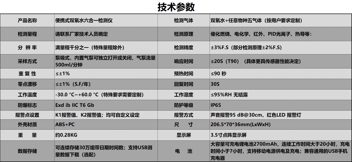 環順科技便攜式雙氧水六合一分析儀是環順科技全新打造的一款多合一手持式雙氧水分析儀。采用原裝進口傳感器及全新32位低功耗ARM處理器; 3.5寸彩色LCD液晶屏顯示,清晰直觀,美觀大方;極佳的人機交互方式,操作簡單方便;中英文雙語言選擇,一體化氣室,最多可同時檢測六種氣體濃度;圖标加文字菜單顯示,實用、直觀、大方; 可發出聲光加震動報警信号,報警及時、準确、無疏漏;防爆結構設計可應用在各種危險的工業場所;産品廣泛應用石油化工、倉儲、消防、能(néng)源電力、應急檢測、受限空間檢測、管道(dào)管路檢測、化工污水處理等需要連續檢測易燃易爆、有毒有害氣體場所和各個行業。