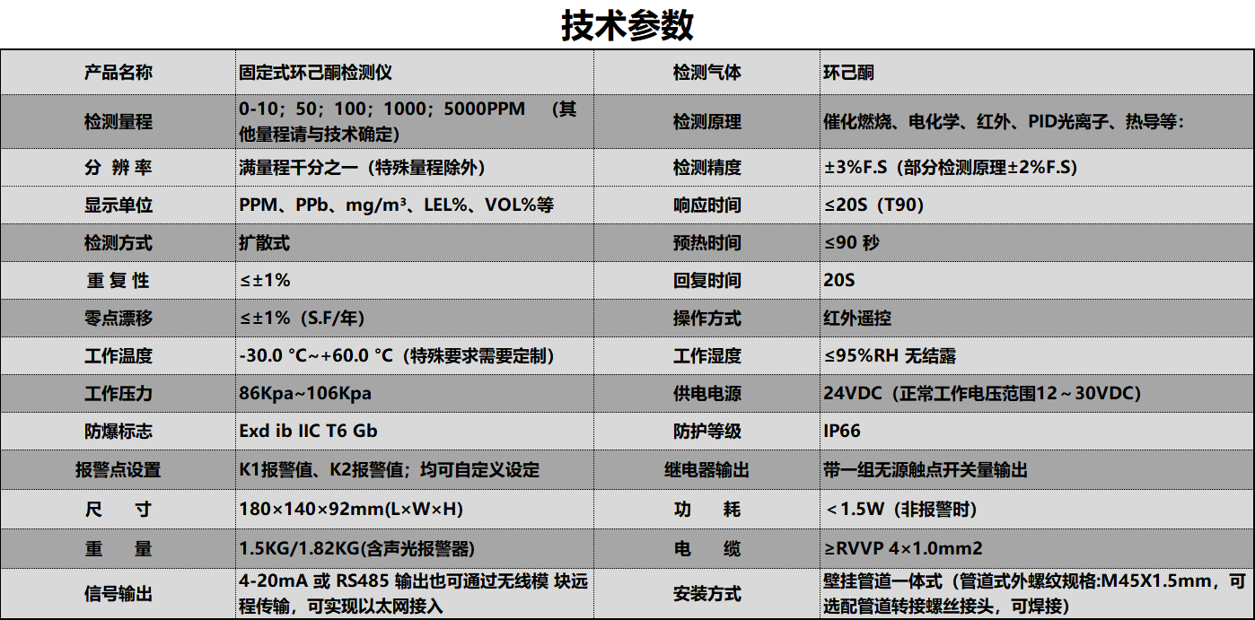 環順科技工業用固定式環己酮檢測儀、環己酮報警器、環己酮分析儀、環己酮探頭、環己酮變送器均采用進口傳感器及全新32位低功耗處理器;儀表盤顯示界面(miàn),數值與進度條同時顯示,美觀大方;電路采用4層布線,對弱信号及抗幹擾更強;獨立的高精度進口16位AD芯片及特有信号處理算法,測量數據精度更高更穩定;4-20mA、RS485、200-1000HZ多種輸出信号可選擇, 方便接入各種報警控制器、PLC、DCS等控制系統;